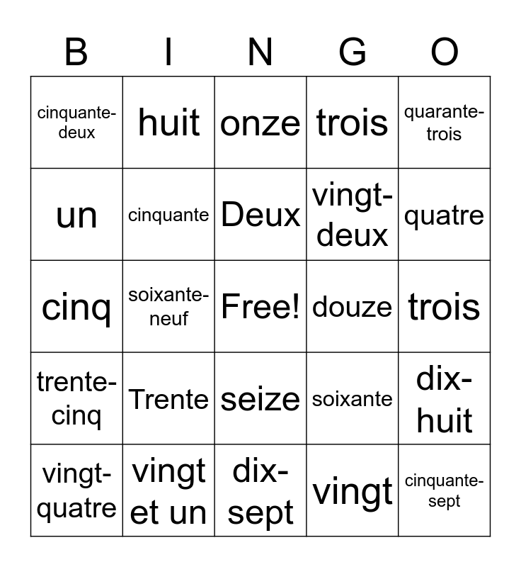 This bingo card has a free space and 24 words: Trente, vingt et un, Deux, vingt-quatre, quarante-trois, cinquante-deux, un, huit, douze, seize, vingt-deux, cinq, soixante, dix-huit, cinquante, vingt, trois, onze, quatre, soixante-neuf, cinquante-sept, trente-cinq, trois and dix-sept.