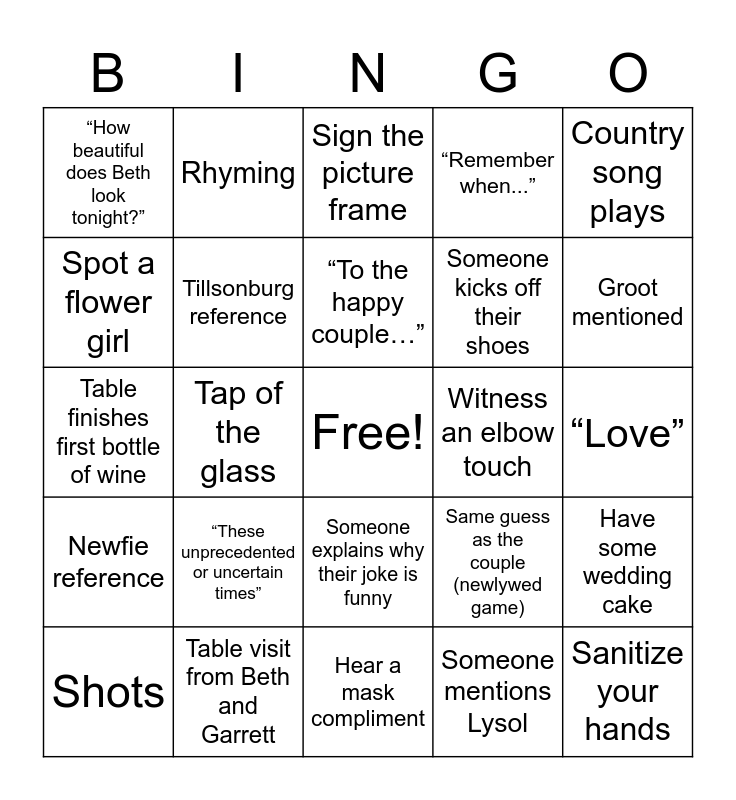 This bingo card has a free space and 33 words: First dance, Someone makes a toast, Tap of the glass, Tears during a speech, Newfie reference, Tillsonburg reference, Country song plays, Shots, Rhyming, “Cheers!”, “To the happy couple…”, Sign the picture frame, Order a drink at the bar, Wedding night reference, Witness an elbow touch, Groot mentioned, Table visit from Beth and Garrett, Table finishes first bottle of wine, “These unprecedented or uncertain times”, Same guess as the couple (newlywed game), Someone explains why their joke is funny, Use of a prop or costume, “How beautiful does Beth look tonight?”, “Love”, Hear a mask compliment, Sanitize your hands, “Remember when...”, Someone kicks off their shoes, Spot a flower girl, Have some wedding cake, Indulge in a drink during cocktail hour, Someone mentions Lysol and Take a photo of Beth and Garrett.