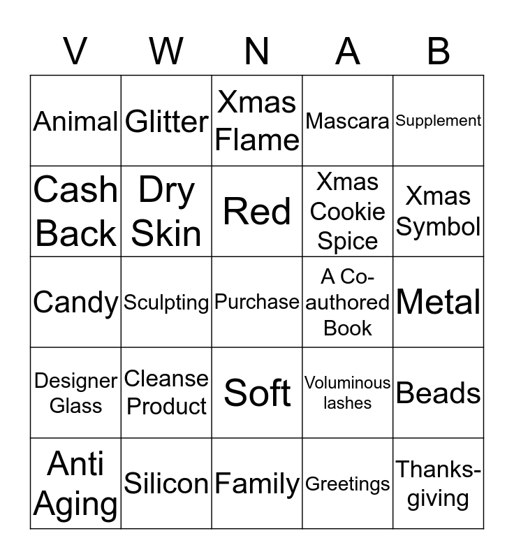 This bingo card has a free space and 24 words: Cleanse Product, Silicon, Red, Anti Aging, Supplement, Animal, Cash Back, Glitter, A Co-authored Book, Soft, Xmas Cookie Spice, Candy, Voluminous lashes, Beads, Dry Skin, Greetings, Metal, Xmas Flame, Xmas Symbol, Sculpting, Thanks- giving, Designer Glass, Mascara and Family.