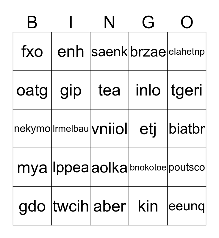 This bingo card has 25 words: lppea, aber, tea, gdo, elahetnp, fxo, oatg, enh, etj, aolka, inlo, nekymo, bnokotoe, poutsco, gip, eeunq, biatbr, saenk, tgeri, lrmelbau, vniiol, twcih, mya, brzae and kin.