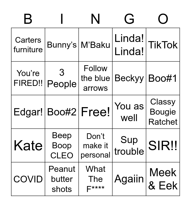 This bingo card has a free space and 24 words: Beep Boop CLEO, Peanut butter shots, Follow the blue arrows, COVID, TikTok, Carters furniture, You’re FIRED!!, Bunny’s, You as well, Don’t make it personal, Beckyy, Edgar!, Sup trouble, SIR!!, 3 People, Agaiin, Classy Bougie Ratchet, M’Baku, Boo#1, Boo#2, Meek & Eek, Kate, Linda! Linda! and What The F****.