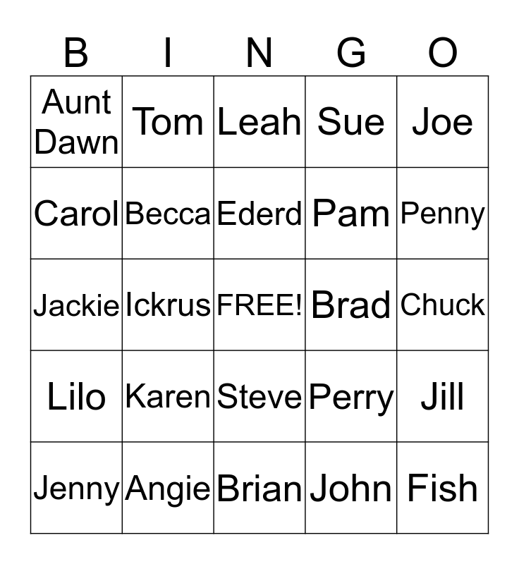 This bingo card has a free space and 24 words: Karen, Angie, Ederd, Jenny, Joe, Aunt Dawn, Carol, Tom, Brad, Steve, Pam, Jackie, Perry, Jill, Becca, John, Chuck, Leah, Penny, Ickrus, Fish, Lilo, Sue and Brian.