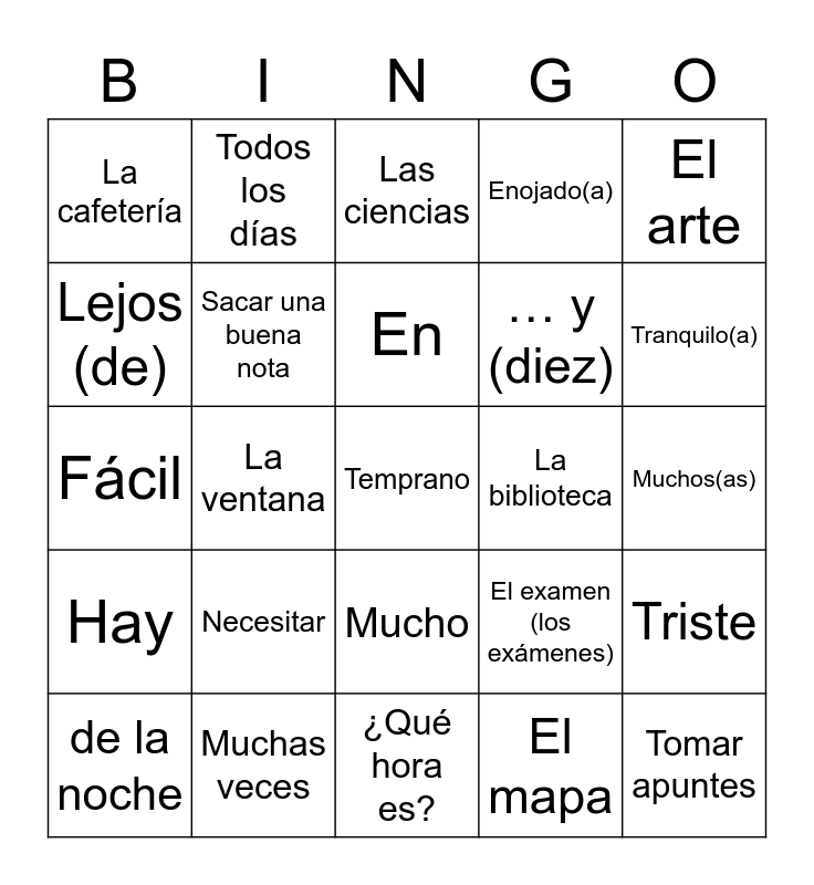 This bingo card has 93 words: Free!, ¿A qué hora es…?, ¿Qué hora es?, A la(s), Es la…/Son las…, de la mañana, de la tarde, de la noche, La hora, El horario, Menos, El minuto, … y cuarto, … y (diez), … y media, El arte, Las ciencias, El español, La historia, El inglés, Las matemáticas, Contestar, Enseñar, Llegar, Necesitar, Sacar una buena nota, Sacar una mala nota, Tomar apuntes, Usar la computadora, De vez en cuando, Muchas veces, Mucho, Nunca, Siempre, Todos los días, Casi, ¿Cuántos(as)…?, Difícil, En, El examen (los exámenes), Fácil, Hay, Muchos(as), Tarde, Temprano, Tener que, El borrador, La calculadora, El cuaderno, El escritorio, El lápiz (los lápices), El mapa, La mochila, El papel, El pizarrón (los pizarrones), La pluma, La puerta, El reloj, La silla, La tiza, La ventana, Al lado (de), Cerca (de), Debajo (de), Delante (de), Dentro (de), Detrás (de), Encima (de), Lejos (de), Cansado(a), Contento(a), Deprimido(a), Emocionado(a), Enojado(a), Nervioso(a), Ocupado(a), Tranquilo(a), Triste, Aburrido(a), Divertido(a), Interesante, El baño, La biblioteca, La cafetería, El gimnasio, La oficina, La oficina del director, El pasillo, ¿Dónde?, ¿Adónde?, ¿Cuándo?, cuando and El problema.