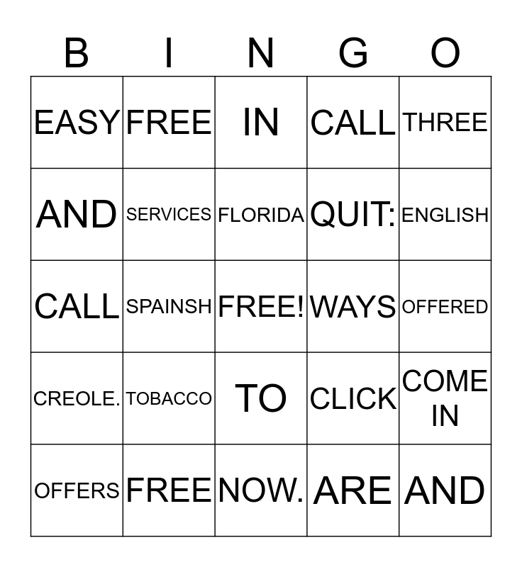 This bingo card has a free space and 24 words: TOBACCO, FREE, FLORIDA, OFFERS, THREE, EASY, AND, FREE, WAYS, TO, QUIT:, CALL, CLICK, COME IN, SERVICES, ARE, OFFERED, IN, ENGLISH, SPAINSH, AND, CREOLE., CALL and NOW..