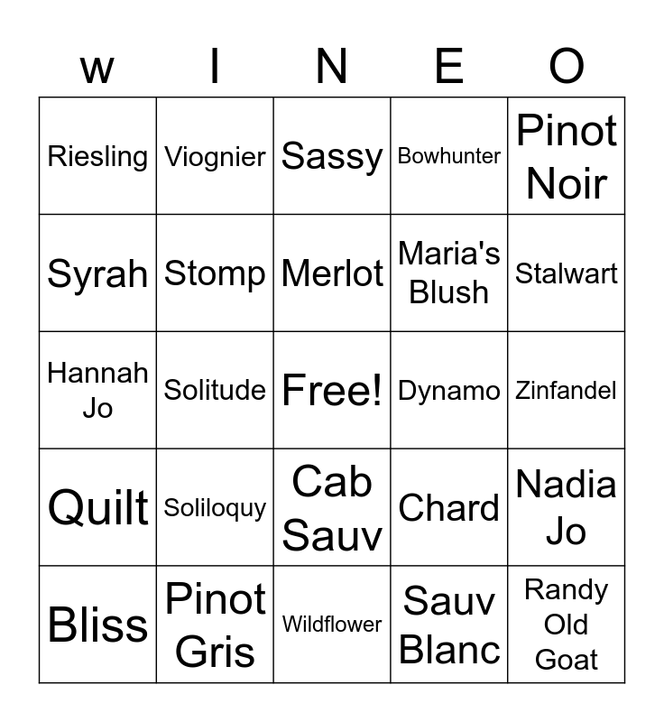 This bingo card has a free space and 26 words: Cab Sauv, Sauv Blanc, Merlot, Pinot Gris, Pinot Noir, Riesling, Syrah, Viognier, Zinfandel, Chard, Maria's Blush, Hannah Jo, Nadia Jo, Bliss, Solitude, Harvest, Bowhunter, Quilt, Sassy, Randy Old Goat, Stalwart, Wildflower, Dynamo, Soliloquy, Stomp and Whitetail.