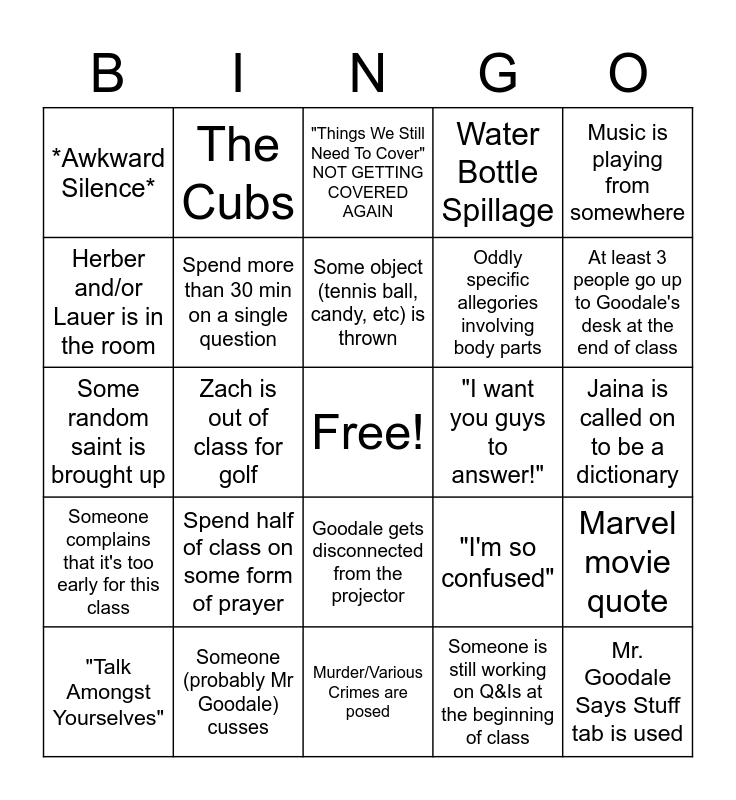 This bingo card has a free space and 37 words: HITLER, STRIP CLUBS, Spend more than 10 min on a single question, Spend more than 30 min on a single question, Marvel movie quote, Spend half of class on some form of prayer, Some object (tennis ball, candy, etc) is thrown, Aidan forgets to remind Goodale to submit attendance, Music is playing from somewhere, Les Mis is brought up, Zach is out of class for golf, Water Bottle Spillage, Mr. Goodale Says Stuff tab is used, Jaina is called on to be a dictionary, Herber and/or Lauer is in the room, Someone complains that it's too early for this class, "Things We Still Have To Cover" ACTUALLY GETTING COVERED FOR ONCE, "Things We Still Need To Cover" NOT GETTING COVERED AGAIN, Goodale gets disconnected from the projector, "I want you guys to answer!", *Awkward Silence*, At least 3 people go up to Goodale's desk at the end of class, "Talk Amongst Yourselves", Murder/Various Crimes are posed, Aidan talks about his work, Someone is still working on Q&Is at the beginning of class, The Cubs, Notre Dame, Utah, Iowa, or Ireland is brought up, Something that can /easily/ be taken out of context is said, Some allegory about GOD, Some pun about Mr. Courter, Someone (probably Mr Goodale) cusses, Some random saint is brought up, Illicit Substances, "I'm so confused", Oddly specific allegories involving body parts and *Insert Random Story about Mr. G in college*.