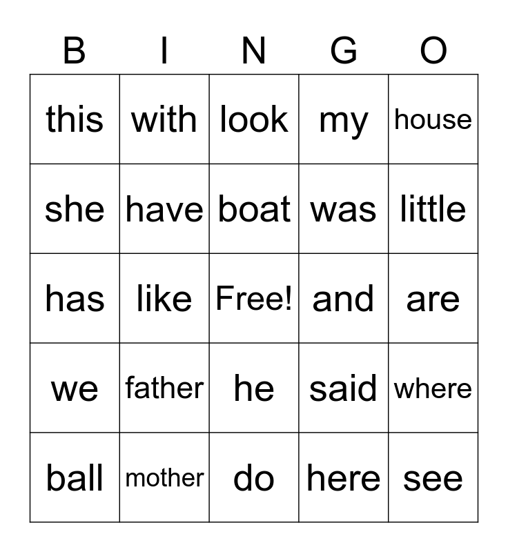 This bingo card has a free space and 24 words: father, mother, boat, ball, house, this, she, with, and, he, was, has, said, where, have, here, are, look, little, like, see, we, my and do.