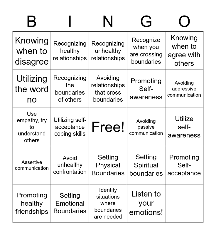 This bingo card has a free space and 24 words: Assertive communication, Setting Emotional Boundaries, Setting Physical Boundaries, Setting Spiritual boundaries, Knowing when to agree with others, Knowing when to disagree, Recognizing healthy relationships, Recognizing unhealthy relationships, Promoting Self-awareness, Promoting Self-acceptance, Utilizing the word no, Recognizing the boundaries of others, Recognizing unhealthy boundaries, Avoiding passive communication, Avoiding aggressive communication, Promoting healthy friendships, Utilizing self-acceptance coping skills, Avoiding relationships that cross boundaries, Recognize when you are crossing boundaries, Utilize self-awareness, Use empathy, try to understand others, Avoid unhealthy confrontation, Identify situations where boundaries are needed and Listen to your emotions!.