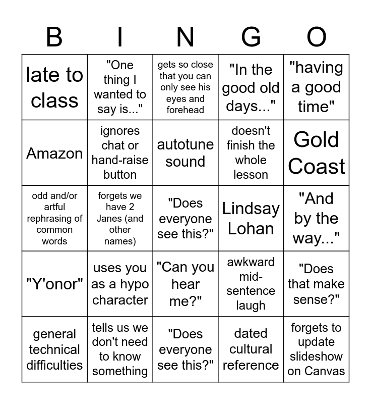 This bingo card has a free space and 31 words: "Does everyone see this?", hypo involving oranges, forgets we have 2 Janes (and other names), long-winded tangent, late to class, gets so close that you can only see his eyes and forehead, ignores chat or hand-raise button, awkward mid-sentence laugh, Lindsay Lohan, dated cultural reference, "And by the way...", forgets to update slideshow on Canvas, bad PowerPoint formatting, comments on people's facial expressions, Gold Coast, mentions a European car brand, "Does that make sense?", uses you as a hypo character, "Y'onor", "Can you hear me?", "having a good time", "and [name] woke up one day...", general technical difficulties, "One thing I wanted to say is...", doesn't finish the whole lesson, Amazon, "In the good old days...", odd and/or artful rephrasing of common words, tells us we don't need to know something, autotune sound and Dominique.
