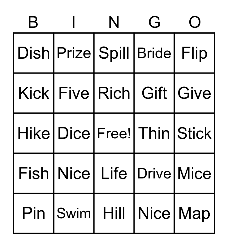 This bingo card has a free space and 24 words: Nice, Swim, Rich, Pin, Flip, Dish, Kick, Prize, Thin, Life, Gift, Hike, Drive, Mice, Five, Nice, Stick, Spill, Give, Dice, Map, Fish, Bride and Hill.