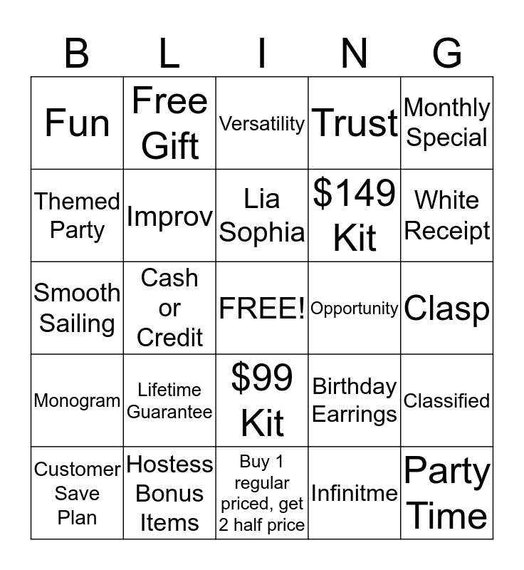 This bingo card has a free space and 24 words: Lifetime Guarantee, Hostess Bonus Items, Lia Sophia, Customer Save Plan, Monthly Special, Fun, Themed Party, Free Gift, Opportunity, $99 Kit, $149 Kit, Smooth Sailing, Birthday Earrings, Classified, Improv, Infinitme, Clasp, Versatility, White Receipt, Cash or Credit, Party Time, Monogram, Trust and Buy 1 regular priced, get 2 half price.