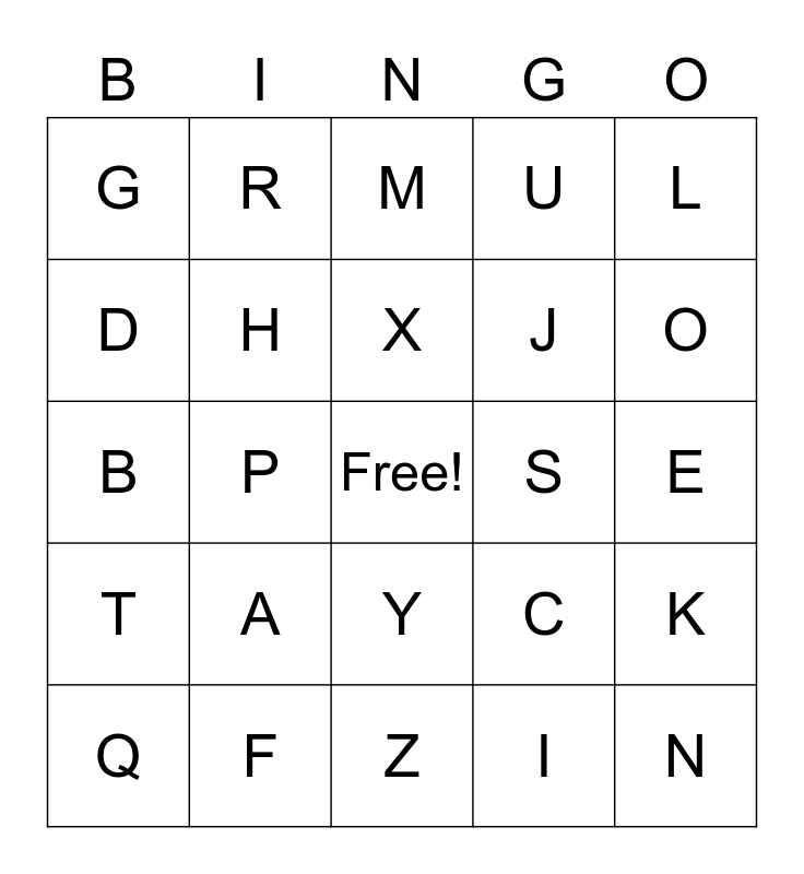 This bingo card has a free space and 24 words: A, F, X, Q, L, G, D, R, S, Y, J, B, C, K, H, I, E, M, O, P, N, T, U and Z.