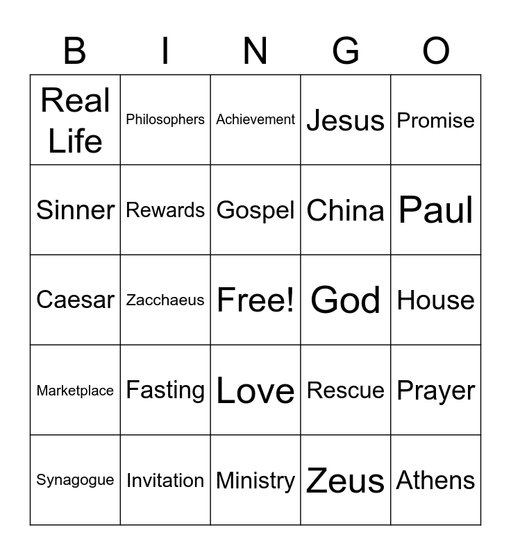 This bingo card has a free space and 26 words: Love, Zeus, Gospel, Invitation, Promise, Real Life, Sinner, Philosophers, House, Rescue, China, Caesar, Prayer, Synagogue, Zacchaeus, Love People, Jesus, Marketplace, Achievement, Athens, Paul, Ministry, God, Fasting, Rewards and Pantry.