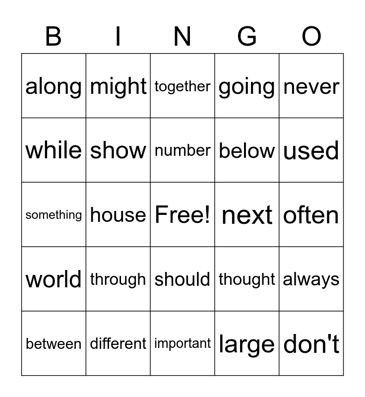 This bingo card has a free space and 24 words: through, different, number, between, never, along, while, might, next, should, below, something, thought, always, show, large, often, together, used, house, don't, world, going and important.