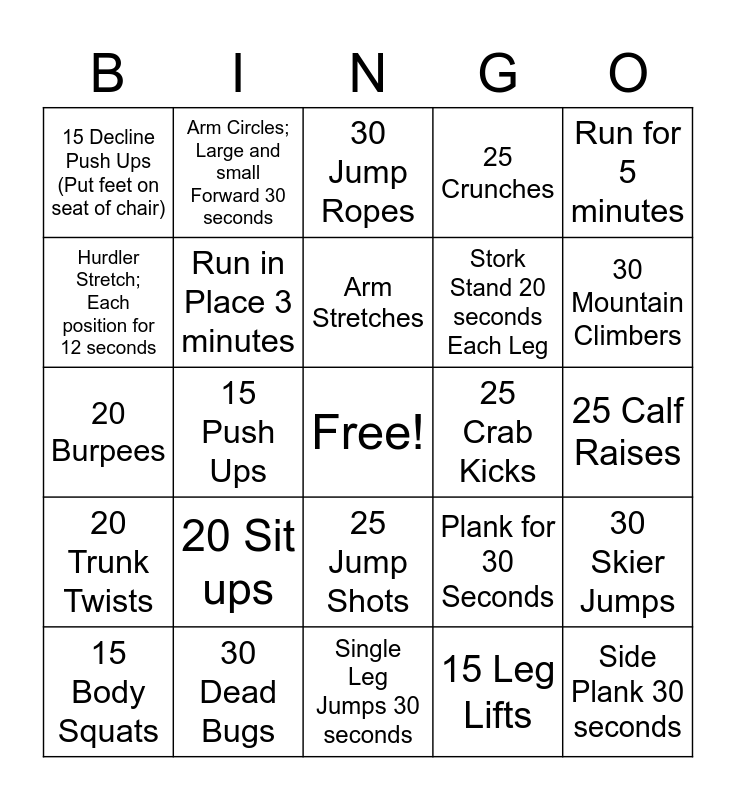 This bingo card has a free space and 24 words: 20 Sit ups, 30 Dead Bugs, Arm Stretches, 15 Body Squats, Run for 5 minutes, 15 Decline Push Ups (Put feet on seat of chair), Hurdler Stretch; Each position for 12 seconds, Arm Circles; Large and small Forward 30 seconds, 25 Crab Kicks, 25 Jump Shots, Stork Stand 20 seconds Each Leg, 20 Burpees, Plank for 30 Seconds, 30 Skier Jumps, Run in Place 3 minutes, 15 Leg Lifts, 25 Calf Raises, 30 Jump Ropes, 30 Mountain Climbers, 15 Push Ups, Side Plank 30 seconds, 20 Trunk Twists, 25 Crunches and Single Leg Jumps 30 seconds.