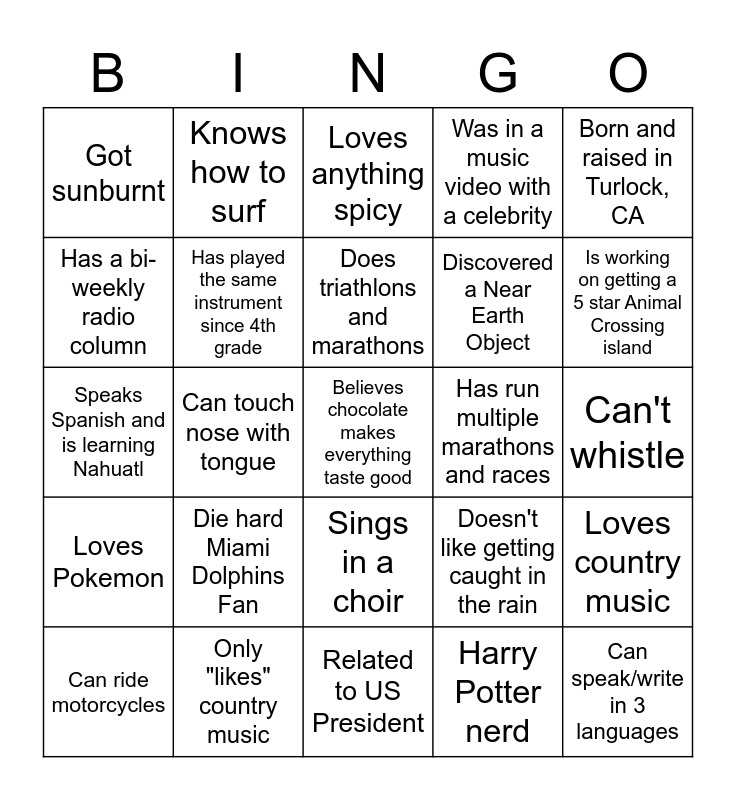 This bingo card has 25 words: Die hard Miami Dolphins Fan, Related to US President, Does triathlons and marathons, Can ride motorcycles, Born and raised in Turlock, CA, Got sunburnt, Has a bi-weekly radio column, Knows how to surf, Has run multiple marathons and races, Sings in a choir, Discovered a Near Earth Object, Speaks Spanish and is learning Nahuatl, Doesn't like getting caught in the rain, Loves country music, Has played the same instrument since 4th grade, Can speak/write in 3 languages, Can't whistle, Loves anything spicy, Is working on getting a 5 star Animal Crossing island, Can touch nose with tongue, Believes chocolate makes everything taste good, Only "likes" country music, Loves Pokemon, Was in a music video with a celebrity and Harry Potter nerd.
