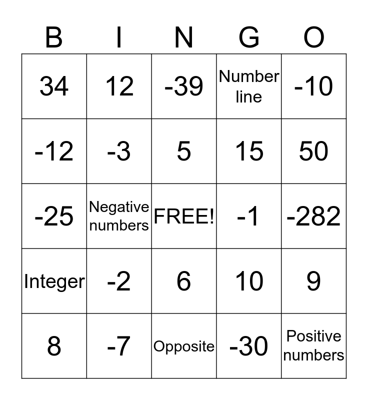 This bingo card has a free space and 24 words: -2, -7, 5, 8, -10, 34, -12, 12, -1, 6, 15, -25, 10, 9, -3, -30, -282, -39, 50, Negative numbers, Positive numbers, Integer, Number line and Opposite.