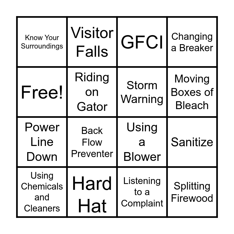 This bingo card has 16 words: Hard Hat, Sanitize, GFCI, Know Your Surroundings, Power Line Down, Visitor Falls, Using a Blower, Listening to a Complaint, Free!, Riding on Gator, Using Chemicals and Cleaners, Changing a Breaker, Back Flow Preventer, Moving Boxes of Bleach, Storm Warning and Splitting Firewood.