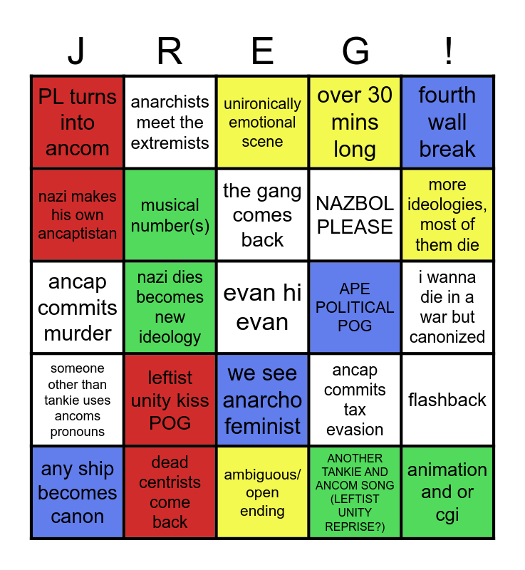 This bingo card has a free space and 24 words: leftist unity kiss POG, dead centrists come back, the gang comes back, any ship becomes canon, fourth wall break, PL turns into ancom, nazi makes his own ancaptistan, anarchists meet the extremists, APE POLITICAL POG, we see anarcho feminist, NAZBOL PLEASE, ancap commits murder, ancap commits tax evasion, flashback, musical number(s), ANOTHER TANKIE AND ANCOM SONG (LEFTIST UNITY REPRISE?), i wanna die in a war but canonized, unironically emotional scene, more ideologies, most of them die, nazi dies becomes new ideology, animation and or cgi, someone other than tankie uses ancoms pronouns, over 30 mins long and ambiguous/ open ending.