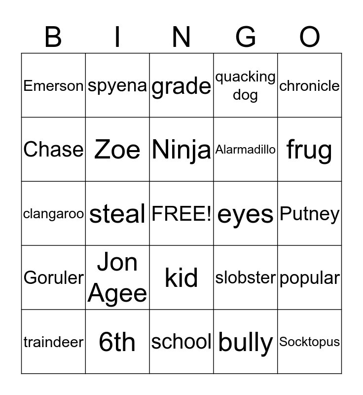This bingo card has a free space and 24 words: Jon Agee, 6th, Ninja, traindeer, chronicle, Emerson, Chase, spyena, eyes, kid, Alarmadillo, clangaroo, slobster, popular, Zoe, bully, Putney, grade, frug, steal, Socktopus, Goruler, quacking dog and school.