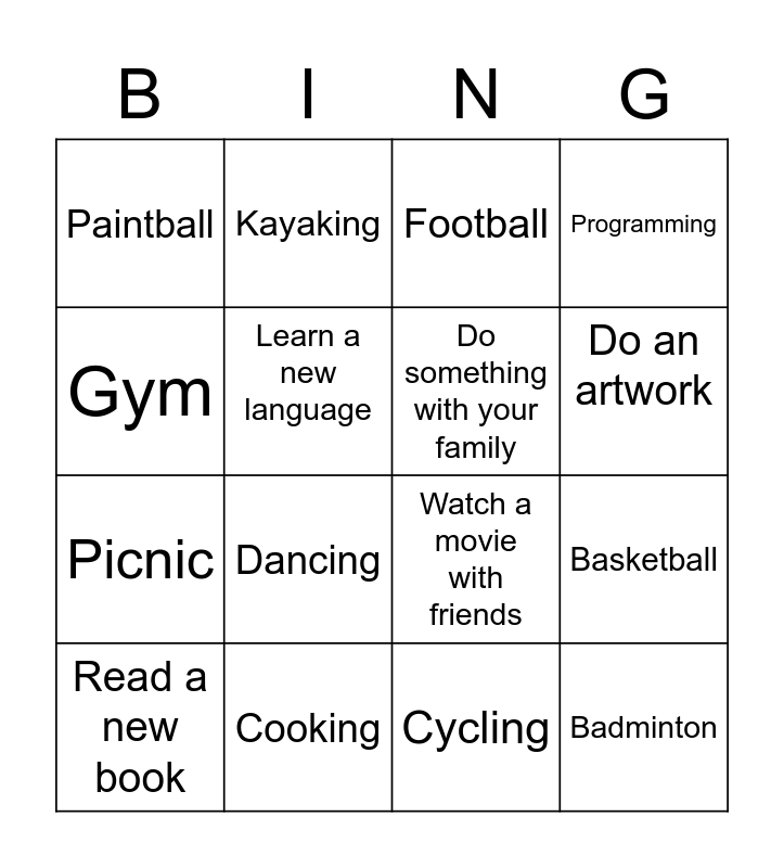 This bingo card has 16 words: Cooking, Basketball, Football, Paintball, Picnic, Kayaking, Watch a movie with friends, Cycling, Gym, Learn a new language, Read a new book, Programming, Dancing, Do an artwork, Do something with your family and Badminton.