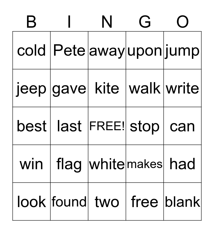 This bingo card has a free space and 42 words: plane, kite, kit, flag, free, had, blank, cold, away, white, can, write, last, jump, little, makes, which, best, Zeke, Pete, jeep, pet, joke, cold, had, not, walk, sleep, bin, pin, tin, win, gave, two, live, look, found, stop, red, when, upon and run.