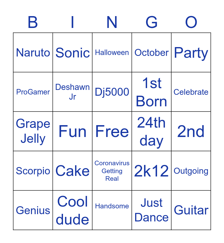 This bingo card has a free space and 30 words: Cool dude, Big Bro, Fun, Triangle, Naruto, Halloween, Deshawn Jr, Coronavirus Getting Real, 24th day, Handsome, 2nd, Guitar, Just Dance, Firefighter, Celebrate, Smart Guy, 2k12, Scorpio, Cake, Party, Grape Jelly, Eight, Sonic, 1st Born, ProGamer, October, Outgoing, Genius, Dj5000 and Xbox.