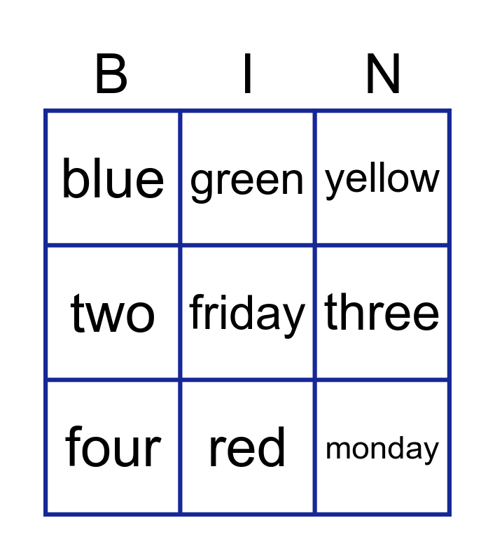 This bingo card has a free space and 11 words: one, red, monday, four, green, yellow, three, tuesday, two, blue and sunday.