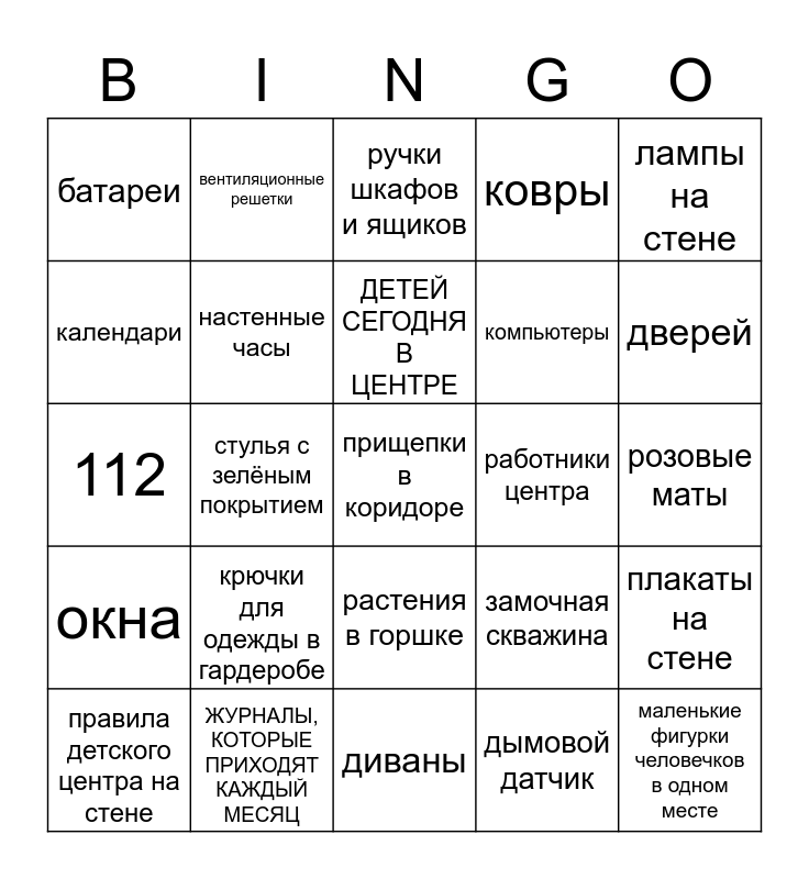 This bingo card has a free space and 24 words: крючки для одежды в гардеробе, ЖУРНАЛЫ, КОТОРЫЕ ПРИХОДЯТ КАЖДЫЙ МЕСЯЦ, ДЕТЕЙ СЕГОДНЯ В ЦЕНТРЕ, правила детского центра на стене, лампы на стене, батареи, календари, вентиляционные решетки, работники центра, растения в горшке, компьютеры, 112, замочная скважина, плакаты на стене, настенные часы, дымовой датчик, розовые маты, ручки шкафов и ящиков, дверей, стулья с зелёным покрытием, маленькие фигурки человечков в одном месте, окна, ковры and диваны.