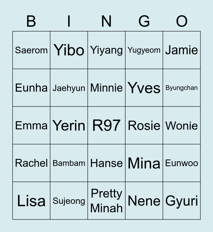 This bingo card has a free space and 24 words: Bambam, Sujeong, Minnie, Lisa, Jamie, Saerom, Eunha, Yibo, Rosie, Hanse, Yves, Emma, Mina, Eunwoo, Jaehyun, Nene, Wonie, Yiyang, Byungchan, Yerin, Gyuri, Rachel, Yugyeom and Pretty Minah.
