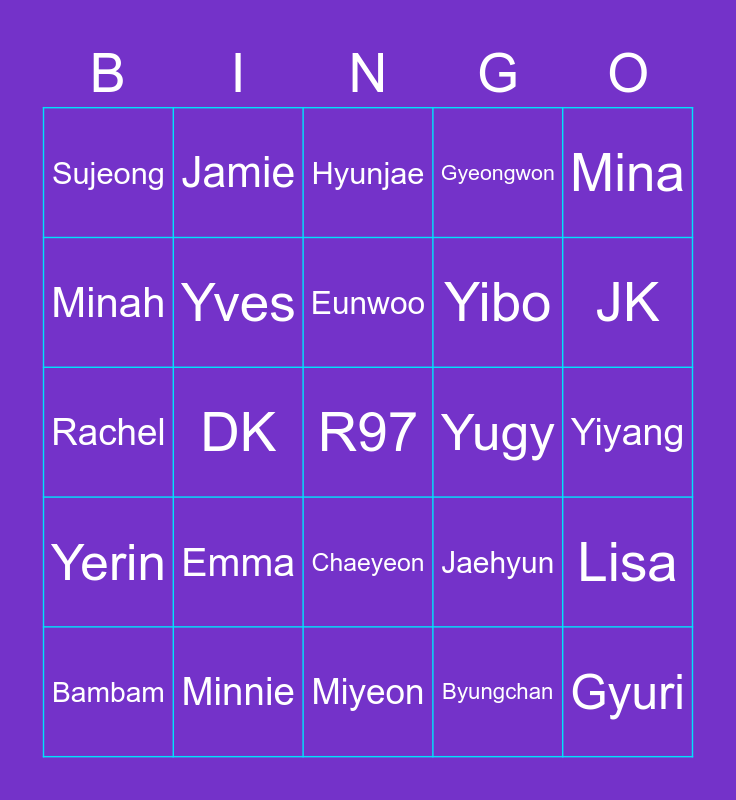This bingo card has a free space and 24 words: Emma, Minnie, Eunwoo, Bambam, Mina, Sujeong, Minah, Jamie, Yugy, Chaeyeon, Yibo, Rachel, Jaehyun, Lisa, Yves, Byungchan, Yiyang, Hyunjae, JK, DK, Gyuri, Yerin, Gyeongwon and Miyeon.
