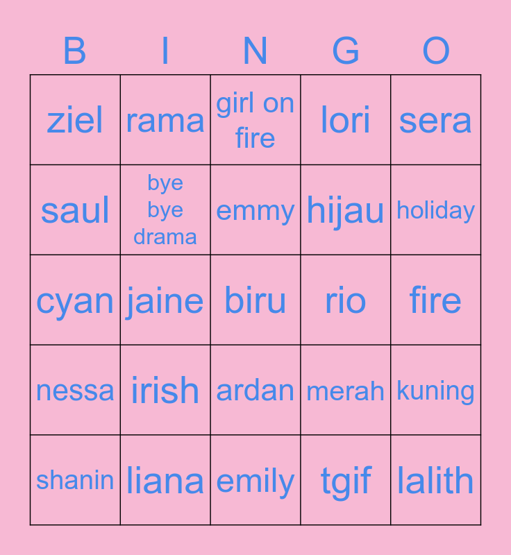 This bingo card has a free space and 24 words: irish, liana, emmy, shanin, sera, ziel, saul, rama, rio, ardan, hijau, cyan, merah, kuning, bye bye drama, tgif, fire, girl on fire, holiday, jaine, lalith, nessa, lori and emily.