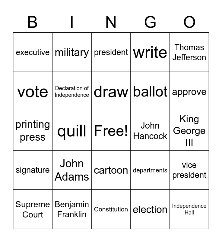 This bingo card has a free space and 40 words: printer, printing press, founders, Declaration of Independence, Benjamin Franklin, cartoon, draw, pamphlet, Thomas Jefferson, signature, quill, write, Independence Hall, King George III, John Hancock, John Adams, legislative, executive, judicial, president, vice president, election, ballot, vote, representative, state, senate, House of Representatives, Bill of Rights, Laws, Congress, Supreme Court, secretary, departments, approve, Constitution, expert, Federal, military and amendments.