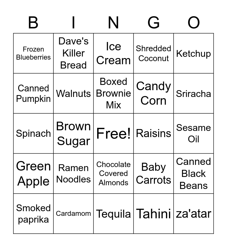 This bingo card has a free space and 24 words: Ramen Noodles, Cardamom, Boxed Brownie Mix, Smoked paprika, Ketchup, Frozen Blueberries, Canned Pumpkin, Dave's Killer Bread, Raisins, Chocolate Covered Almonds, Candy Corn, Spinach, Baby Carrots, Canned Black Beans, Walnuts, Tahini, Sesame Oil, Ice Cream, Sriracha, Brown Sugar, za'atar, Green Apple, Shredded Coconut and Tequila.