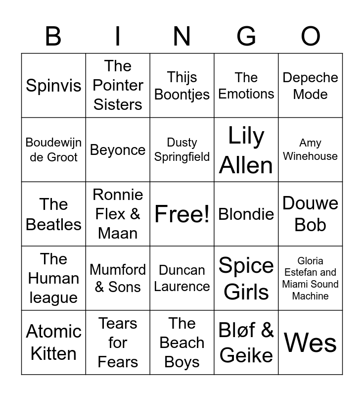 This bingo card has a free space and 75 words: Lady Gaga & Bradley Cooper, Billie Eilish, Thijs Boontjes, Marco Borsato, Bee Gees, Merol, Scissor Sisters, Stevie Wonder, Alessi Brothers, The Kooks, De Règâhs, The Supremes, Dusty Springfield, Boudewijn de Groot, Whitney Houston, Ronnie Flex & Maan, King Africa, Wes, My Baby, Depeche Mode, Abba, The Beatles, Beyonce, The Pointer Sisters, The Emotions, Elton John, Phil Collins, Lipps Inc., Kylie Minogue, Eve, Taylor Swift, Eminem, Andrea Bocelli, Spice Girls, Amy Winehouse, Lily Allen, Rick Astley, Justin Bieber, Douwe Bob, Bløf & Geike, UB40, Red Hot Chilli Peppers, Justin Timberlake, Supertramp, Muse, Aretha Franklin, Atomic Kitten, Spinvis, Vance Joy, Typhoon, Robin Thicke & Pharell Williams, Duncan Laurence, Anouk, Krezip, The Opposites, Fleetwood Mac, The Rolling Stones, P!nk, Britney Spears, Shakira, Mumford & Sons, Stromae, Kraantje Pappie, Rihanna, Donna Summer, Blondie, David Bowie, Wham!, Prince, Gloria Estefan and Miami Sound Machine, The Human league, Tears for Fears, New Order, The Beach Boys and Paul Simon.