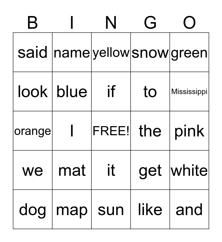 This bingo card has a free space and 24 words: mat, map, if, dog, green, said, look, name, the, it, to, orange, get, white, blue, like, pink, yellow, Mississippi, I, and, we, snow and sun.