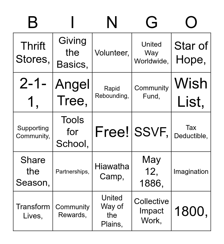 This bingo card has a free space and 33 words: Salvation Army, Restore Hope, Tools for School,, Warm Hearts,, Share the Season,, Angel Tree,, Star of Hope,, Transform Lives,, Giving the Basics,, Emergency Shelter,, Rapid Rebounding,, Volunteer,, Donate,, Foster Care,, SSVF,, Wish List,, Community Rewards,, Supporting Community,, Partnerships,, May 12, 1886,, Hiawatha Camp,, Pandemic,, Thrift Stores,, Tax Deductible,, United Way of the Plains,, 1800,, United Way Worldwide,, Community Fund,, 2-1-1,, Imagination, Library,, Collective Impact Work, and UW Focus.