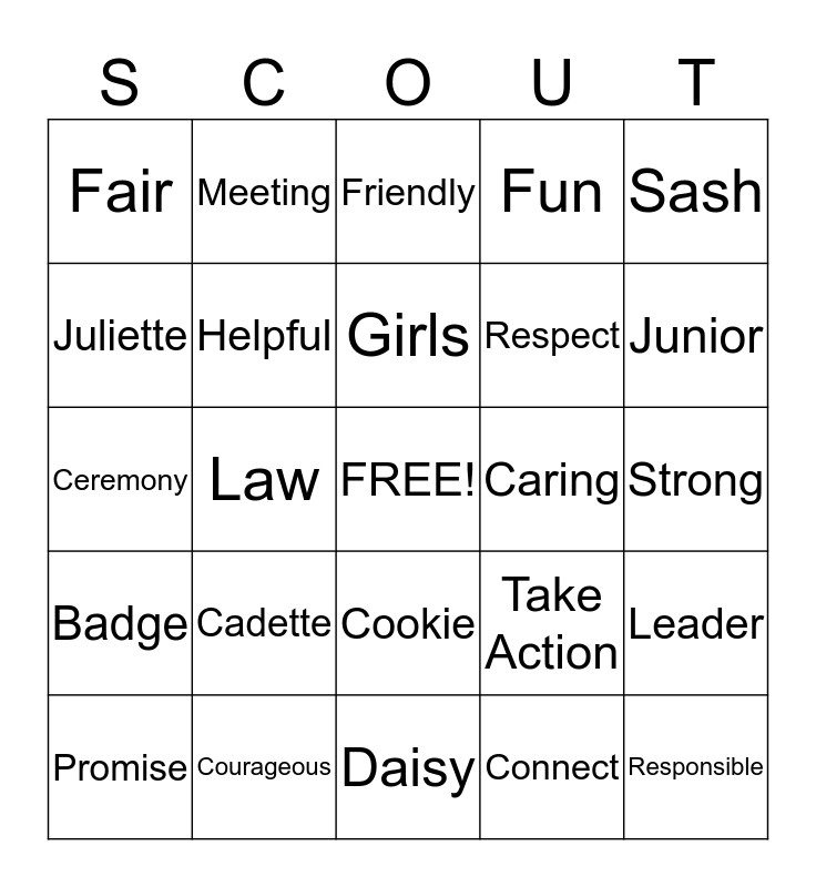 This bingo card has a free space and 29 words: Promise, Discover, Law, Honest, Fair, Friendly, Helpful, Cadette, Caring, Courageous, Strong, Responsible, Daisy, Connect, Junior, Brownie, Cookie, Badge, Sash, Ceremony, Take Action, Friends, Respect, Juliette, Fun, Meeting, Leader, Girls and Uniform.