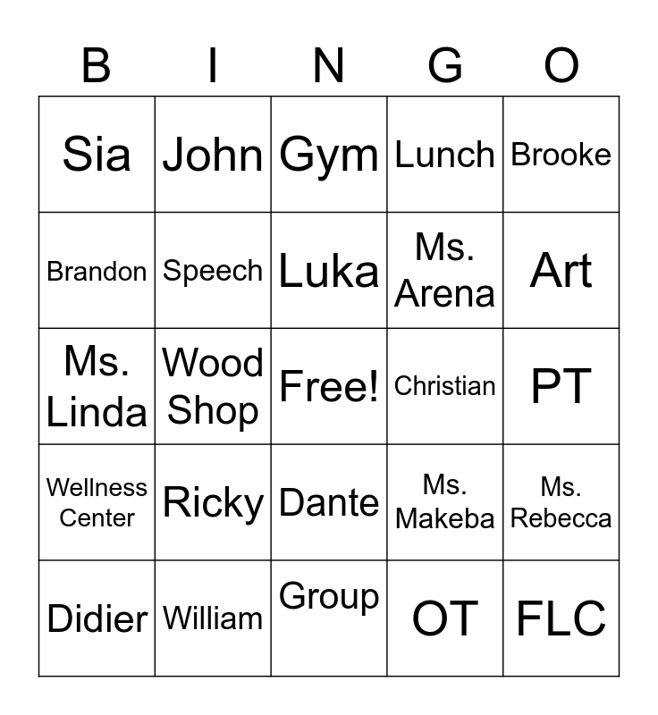 This bingo card has a free space and 24 words: Ricky, William, Luka, Didier, Brooke, Sia, Brandon, John, Christian, Dante, Ms. Arena, Ms. Linda, Ms. Makeba, Ms. Rebecca, Speech, OT, PT, Gym, Art, Wood Shop, FLC, Wellness Center, Lunch and Group.