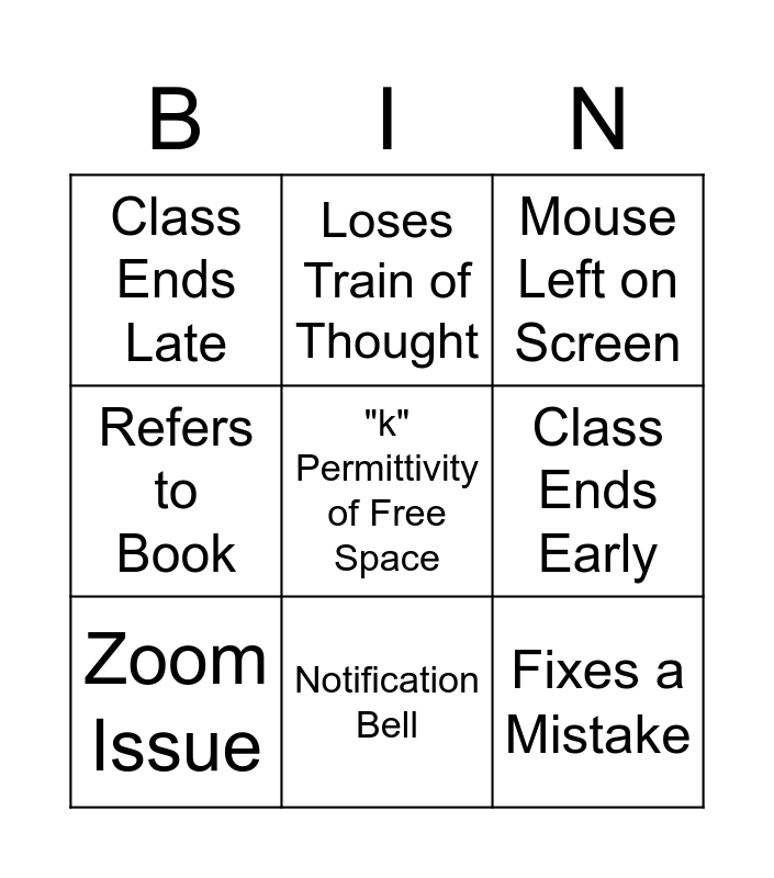 This bingo card has a free space and 8 words: Class Ends Early, Mouse Left on Screen, Loses Train of Thought, Zoom Issue, Class Ends Late, Fixes a Mistake, Refers to Book and Notification Bell.
