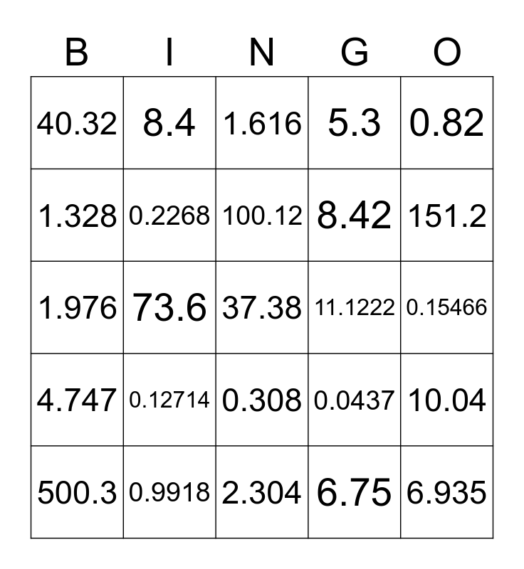 This bingo card has 30 words: 0.9918, 0.31635, 73.6, 16.5, 40.32, 1.616, 0.2268, 0.308, 11.1222, 2.304, 0.15466, 37.38, 6.75, 6.935, 151.2, 0.0064, 0.0437, 4.747, 0.12714, 0.82, 1.976, 1.216, 8.4, 8.42, 1.328, 5.3, 10.04, 500.3, 100.12 and 50.46.