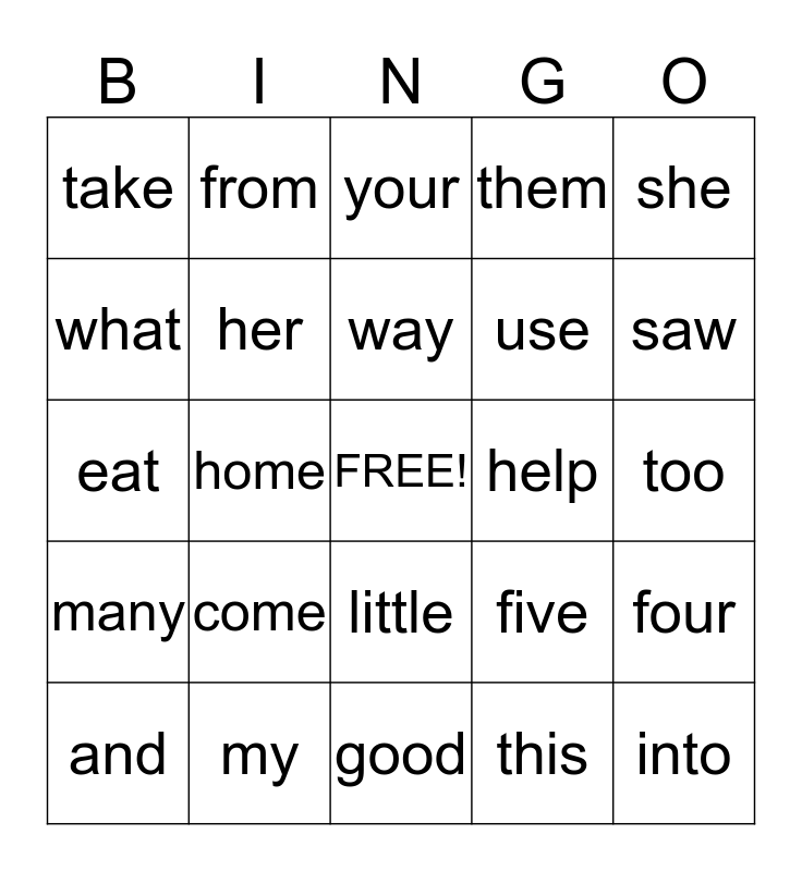 This bingo card has a free space and 24 words: come, my, way, and, she, take, what, from, help, little, use, eat, five, four, her, this, too, your, saw, home, into, many, them and good.