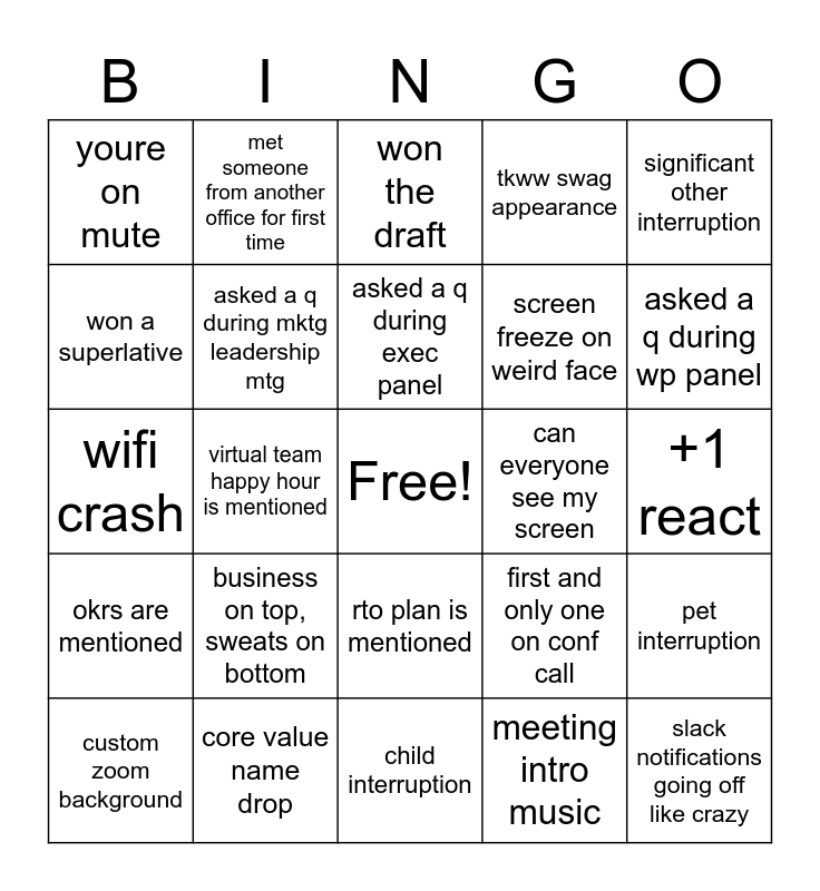 This bingo card has a free space and 24 words: business on top, sweats on bottom, core value name drop, asked a q during exec panel, custom zoom background, significant other interruption, youre on mute, won a superlative, met someone from another office for first time, can everyone see my screen, rto plan is mentioned, screen freeze on weird face, wifi crash, first and only one on conf call, pet interruption, asked a q during mktg leadership mtg, meeting intro music, +1 react, won the draft, asked a q during wp panel, virtual team happy hour is mentioned, slack notifications going off like crazy, okrs are mentioned, tkww swag appearance and child interruption.