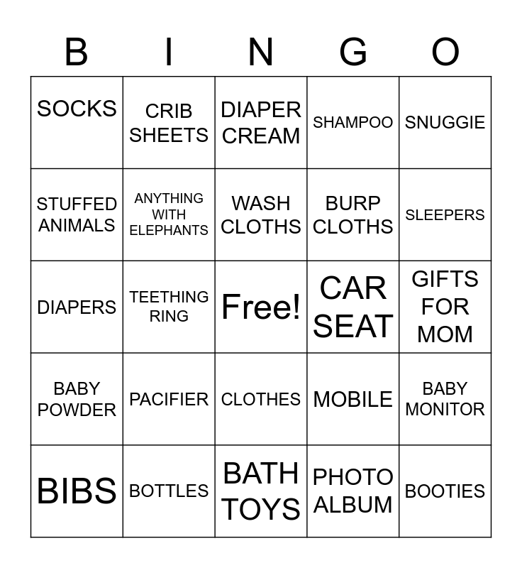 This bingo card has a free space and 24 words: PACIFIER, BOTTLES, WASH CLOTHS, BIBS, SNUGGIE, SOCKS, STUFFED ANIMALS, CRIB SHEETS, CAR SEAT, CLOTHES, BURP CLOTHS, DIAPERS, MOBILE, BABY MONITOR, ANYTHING WITH ELEPHANTS, PHOTO ALBUM, GIFTS FOR MOM, DIAPER CREAM, SLEEPERS, TEETHING RING, BOOTIES, BABY POWDER, SHAMPOO and BATH TOYS.
