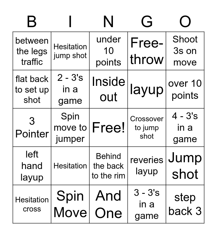 This bingo card has a free space and 24 words: Hesitation, Spin Move, Inside out, Hesitation cross, Shoot 3s on move, between the legs traffic, flat back to set up shot, Hesitation jump shot, Crossover to jump shot, Behind the back to the rim, layup, 3 Pointer, reveries layup, Jump shot, 2 - 3's in a game, 3 - 3's in a game, 4 - 3's in a game, under 10 points, over 10 points, Spin move to jumper, step back 3, left hand layup, Free-throw and And One.