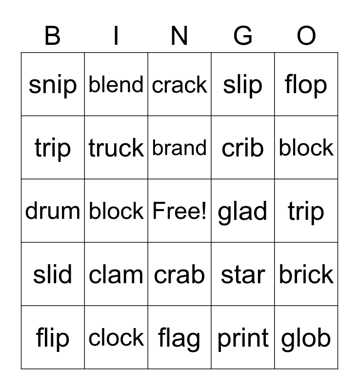 This bingo card has a free space and 29 words: flip, stop, block, sled, snip, crack, truck, clam, glad, clock, trip, glob, flag, print, block, stick, crab, slid, flop, drum, star, prop, crib, trip, slip, blend, brick, brand and track.