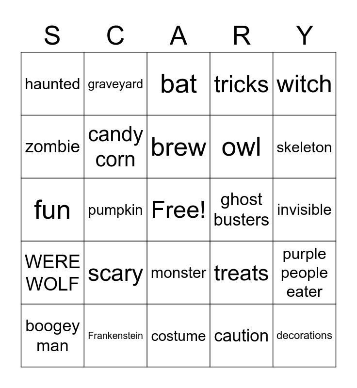 This bingo card has a free space and 50 words: black cat, decorations, spooky, costume, scary, candy, graveyard, jack o lantern, zombie, help, candy corn, tricks, purple people eater, treats, skull, Halloween, brew, ghost busters, howl, witch, pumpkin, caution, haunted, owl, celebration, beware, skeleton, gargoyle, bat, monster, gool, spider, ghost, careful, Frankenstein, clown, vampire, pranks, scream, invisible, invisible man, mummy, run, grim repaper, boogey man, fun, creepy, AHHHHHHHHHH, WERE WOLF and WERE WOLFS IN LONDAN.