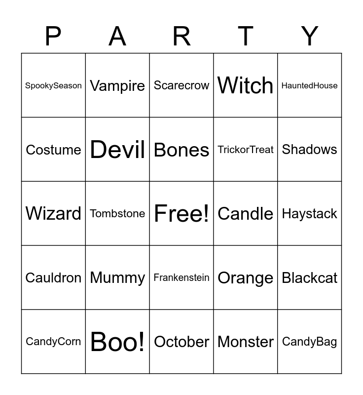 This bingo card has a free space and 39 words: Mask, Spider, Bat, Devil, CandyCorn, Frankenstein, Bones, Decorate, HauntedHouse, Cauldron, Tombstone, Witch, CandyBag, Haystack, Candle, Mummy, Candy, SpookySeason, Apple, Orange, Costume, October, TrickorTreat, Shadows, Spiderweb, Lantern, Werewolf, Coffin, Potion, Vampire, Broom, Skeleton, Scarecrow, Boo!, Monster, Castle, Blackcat, Wizard and Pumpkin.
