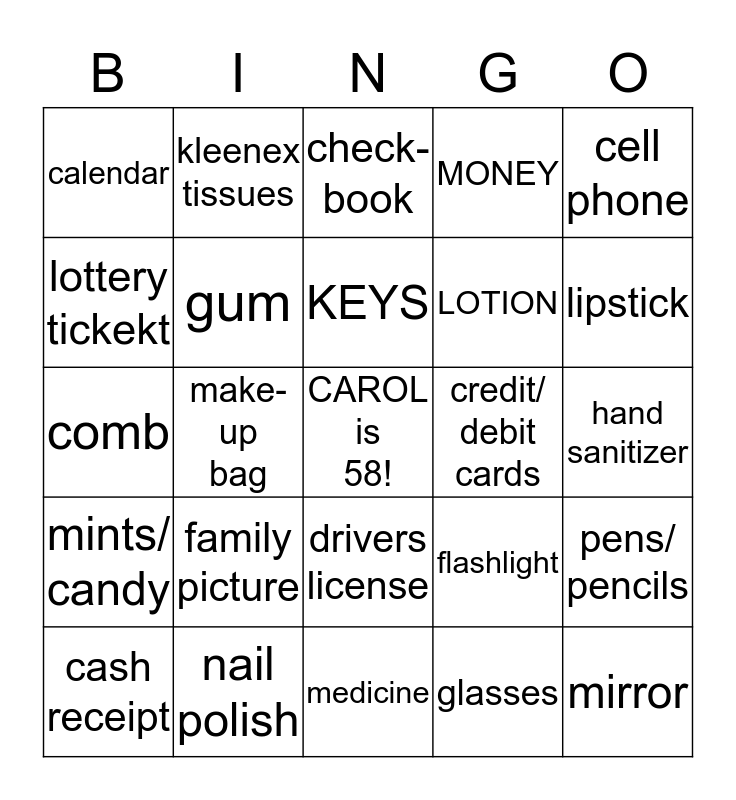 This bingo card has a free space and 24 words: family picture, nail polish, KEYS, cash receipt, cell phone, calendar, lottery tickekt, kleenex tissues, credit/ debit cards, drivers license, LOTION, comb, flashlight, pens/ pencils, gum, glasses, hand sanitizer, check- book, lipstick, make-up bag, mirror, mints/ candy, MONEY and medicine.