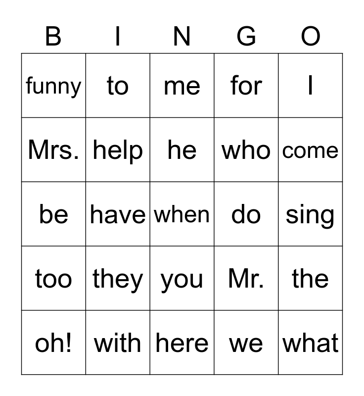 This bingo card has a free space and 41 words: play, be, and, help, with, you, he, look, I, too, have, for, what, sing, do, they, find, funny, no, me, the, my, here, who, all, does, we, she, come, like, go, to, oh!, ow!, Mr., Mrs., some, one, said, little and their.